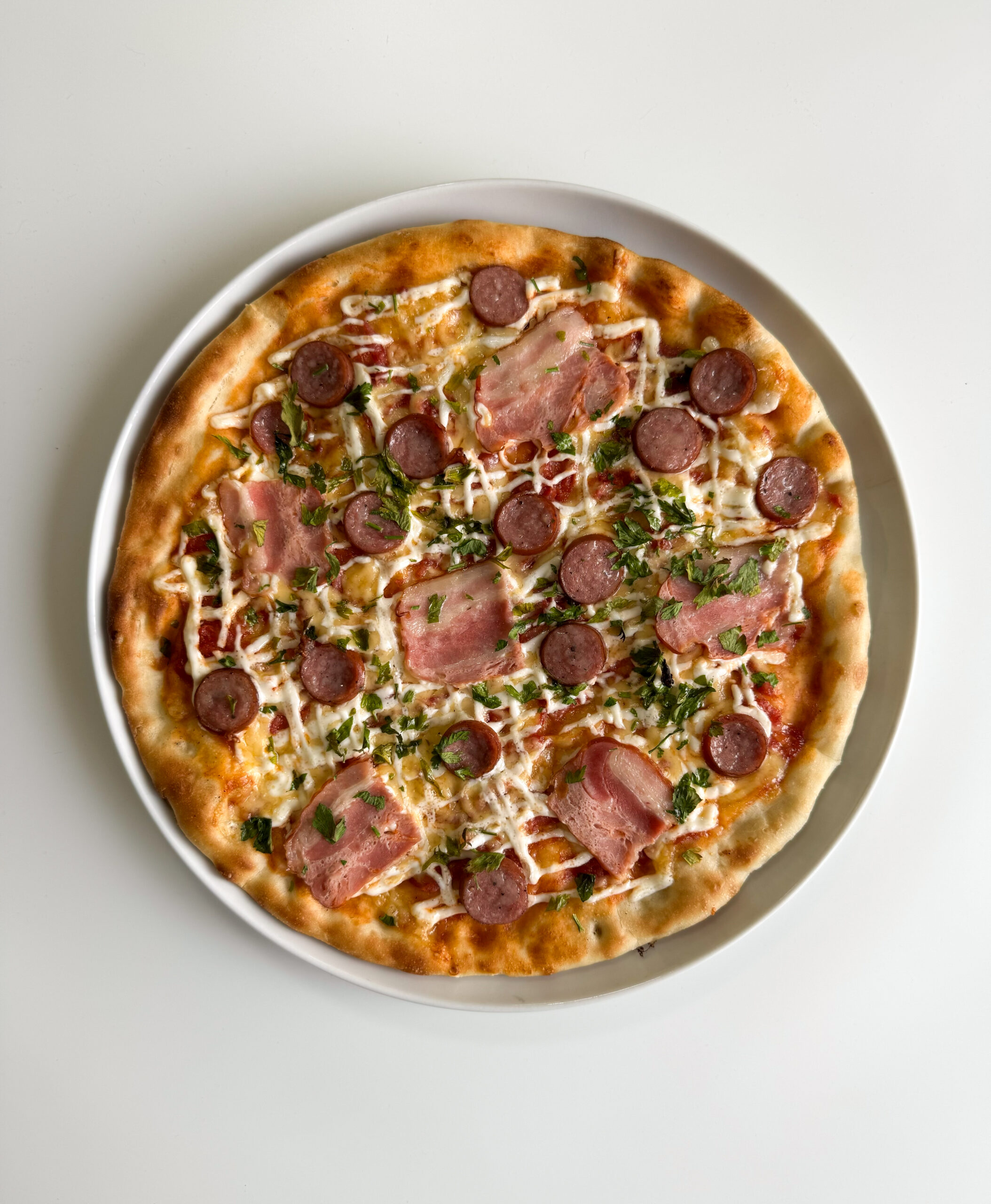 Тесто дрожжевое, соус томатный, колбаса салями в/с, кетчуп, сыр твердый, майонез, бекон варено-копченый, колбаски охотничьи классические, зелень.