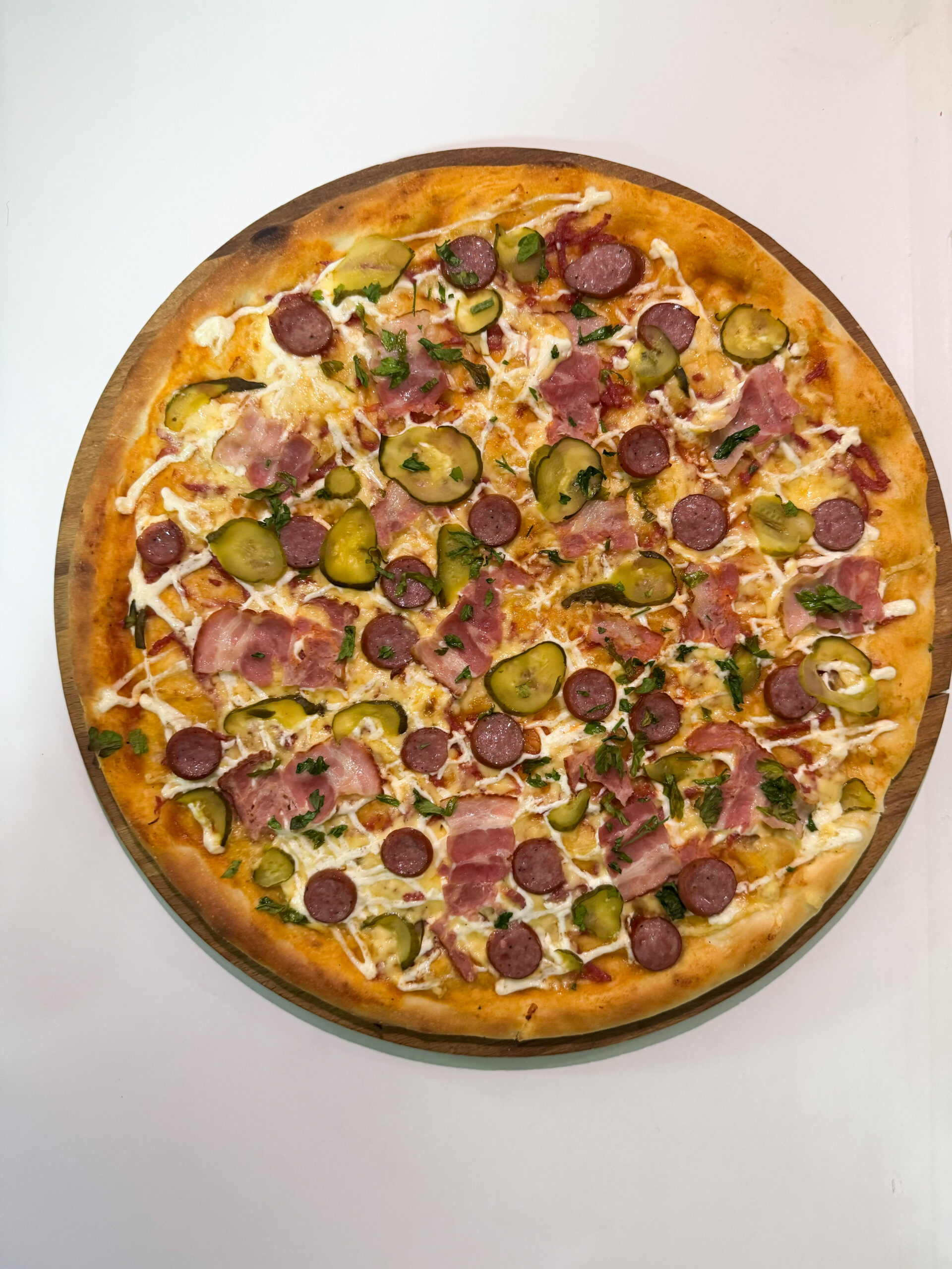 Тесто дрожжевое, соус томатный, колбаса салями в/с, сыр твердый, майонез, бекон варено-копченый, колбаски охотничьи классические, огурцы маринованные, зелень.